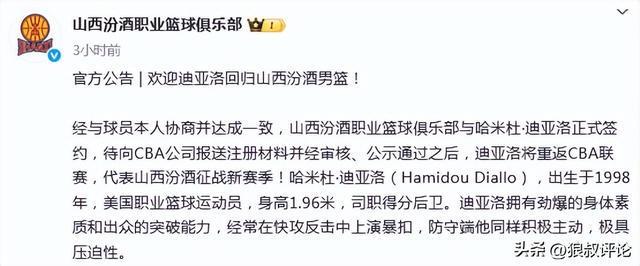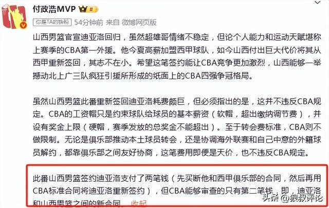 媒体人:山西重签迪亚洛支付了两笔钱 CBA能够审查的仅是第二笔钱